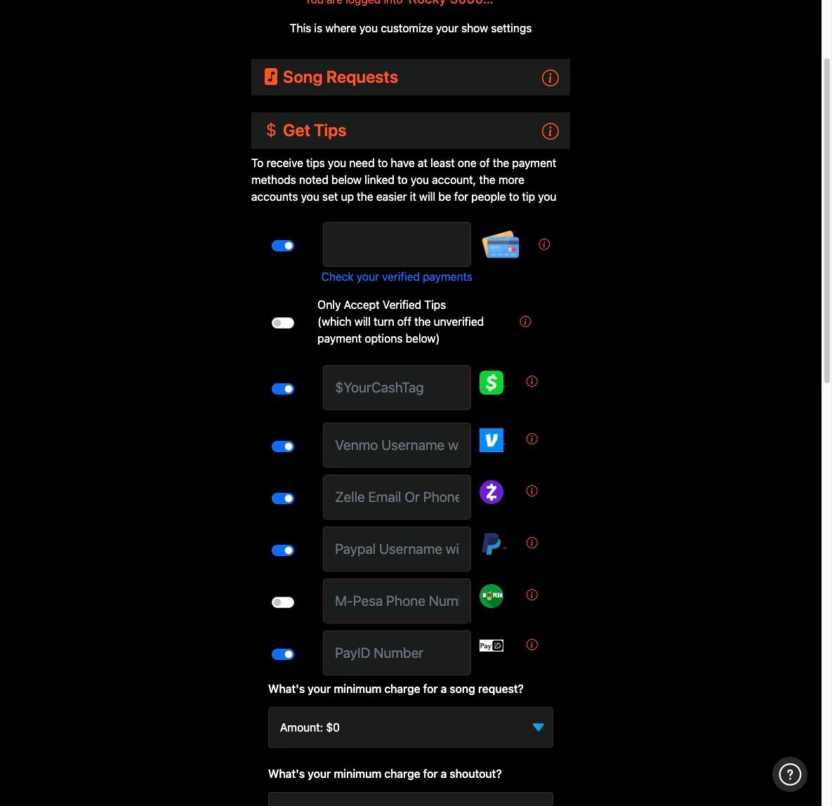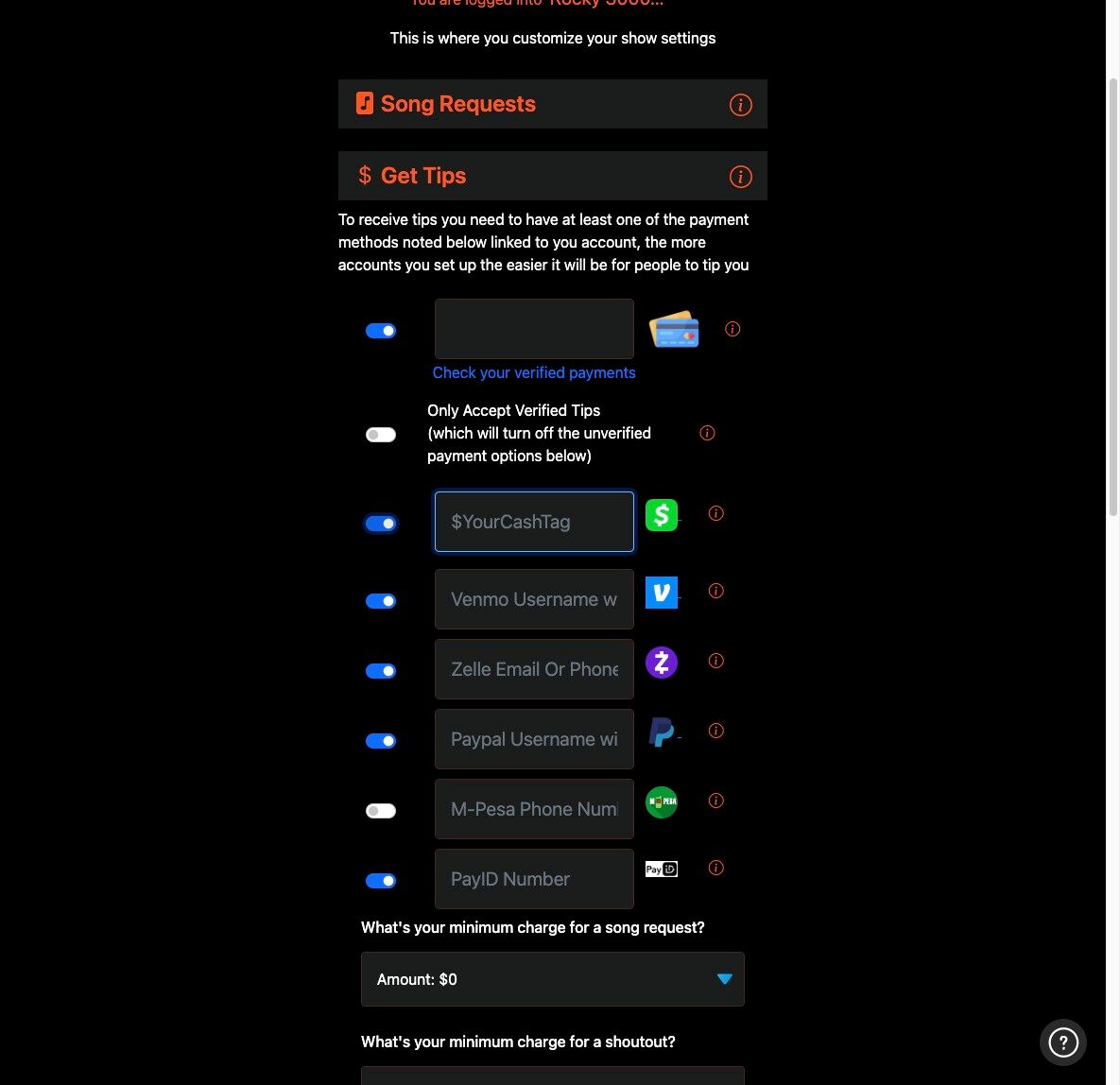 4. For Unverified Tips, enter your payment options. We support Cash App, Venmo, Zelle, Paypal, PayID and M-pesa