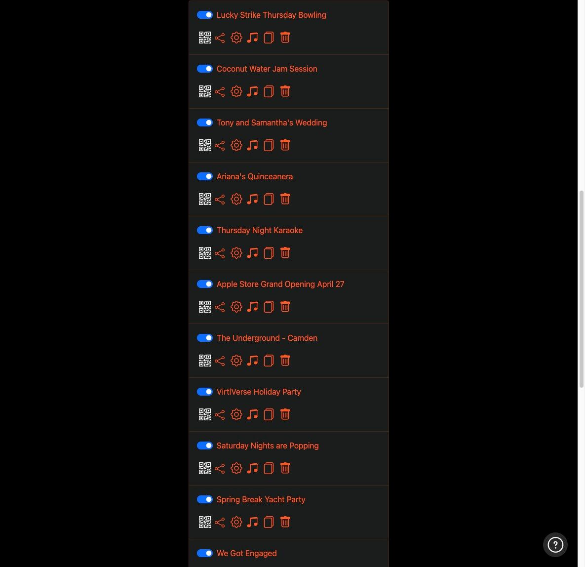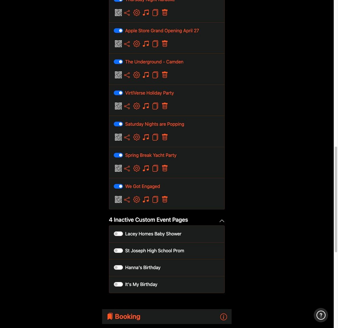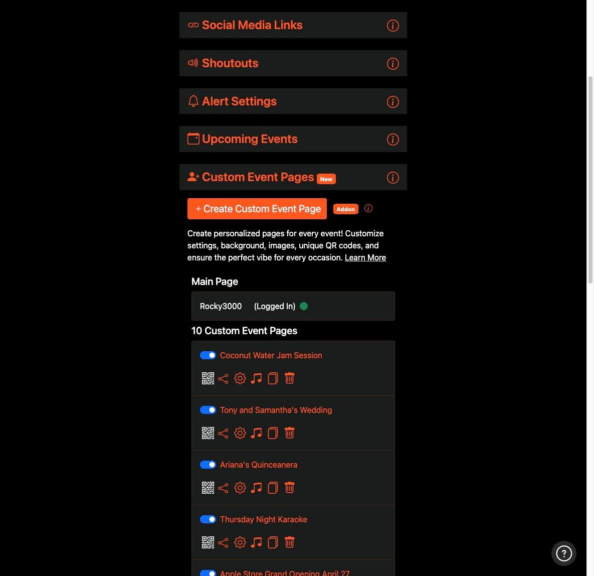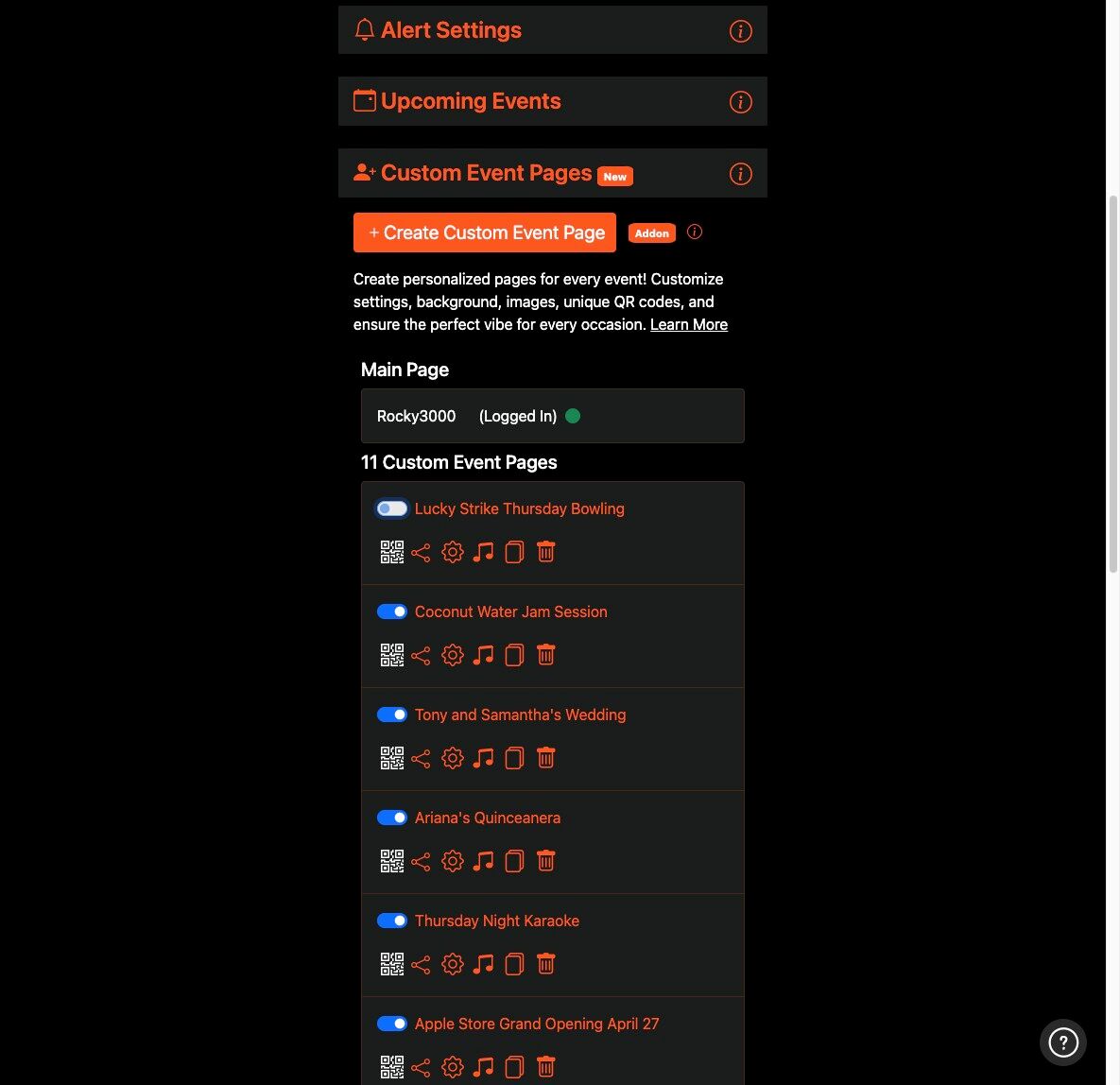 7. You can delete, copy, view, share and make changes to your Custom Event Pages by clicking the appropriate icon.