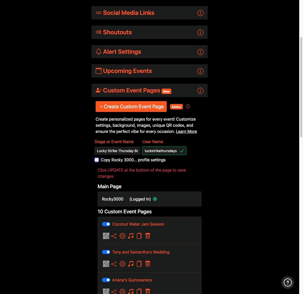 4. Create an Event Name and User Name for the Custom Event Page. You can also copy the settings of your main account if you wish.