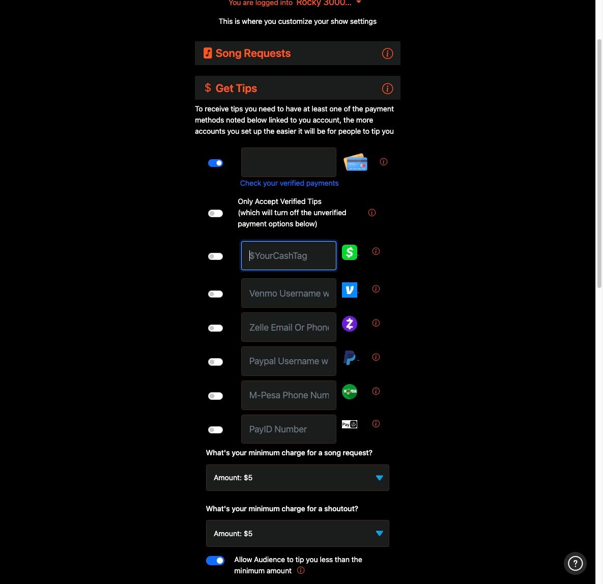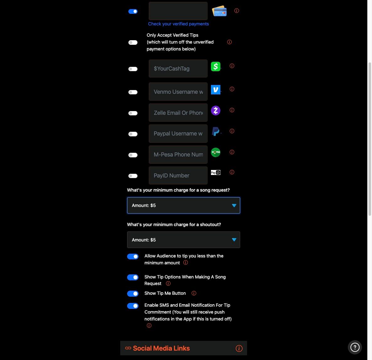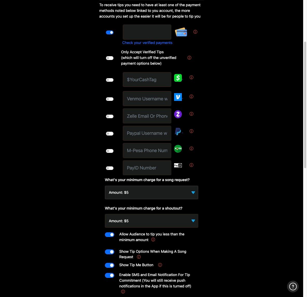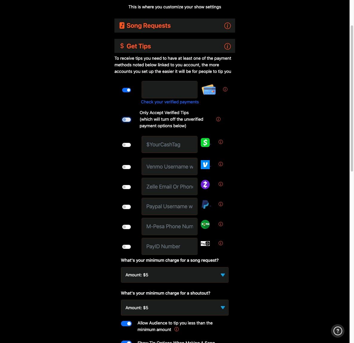 4. You can set minimum amounts for Song Requests. We only receive payment verification for Verified tips so keep this in mind when turning on this option.