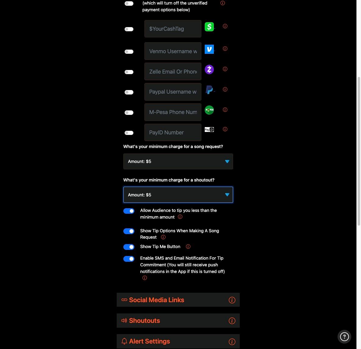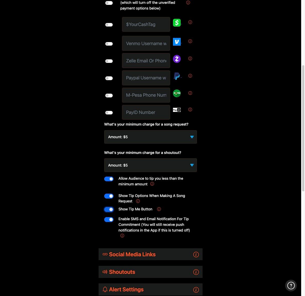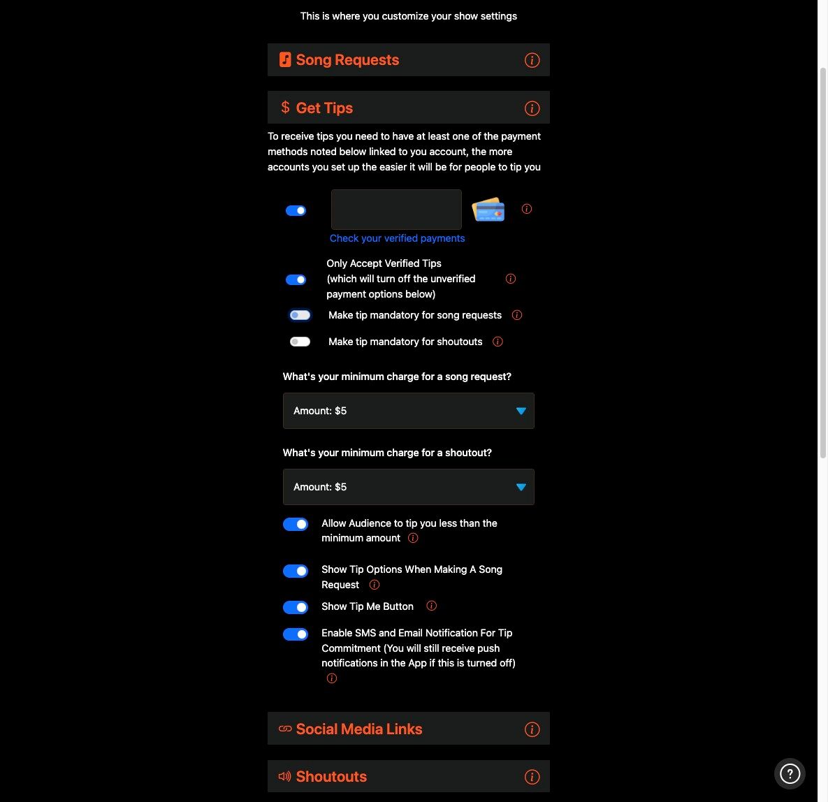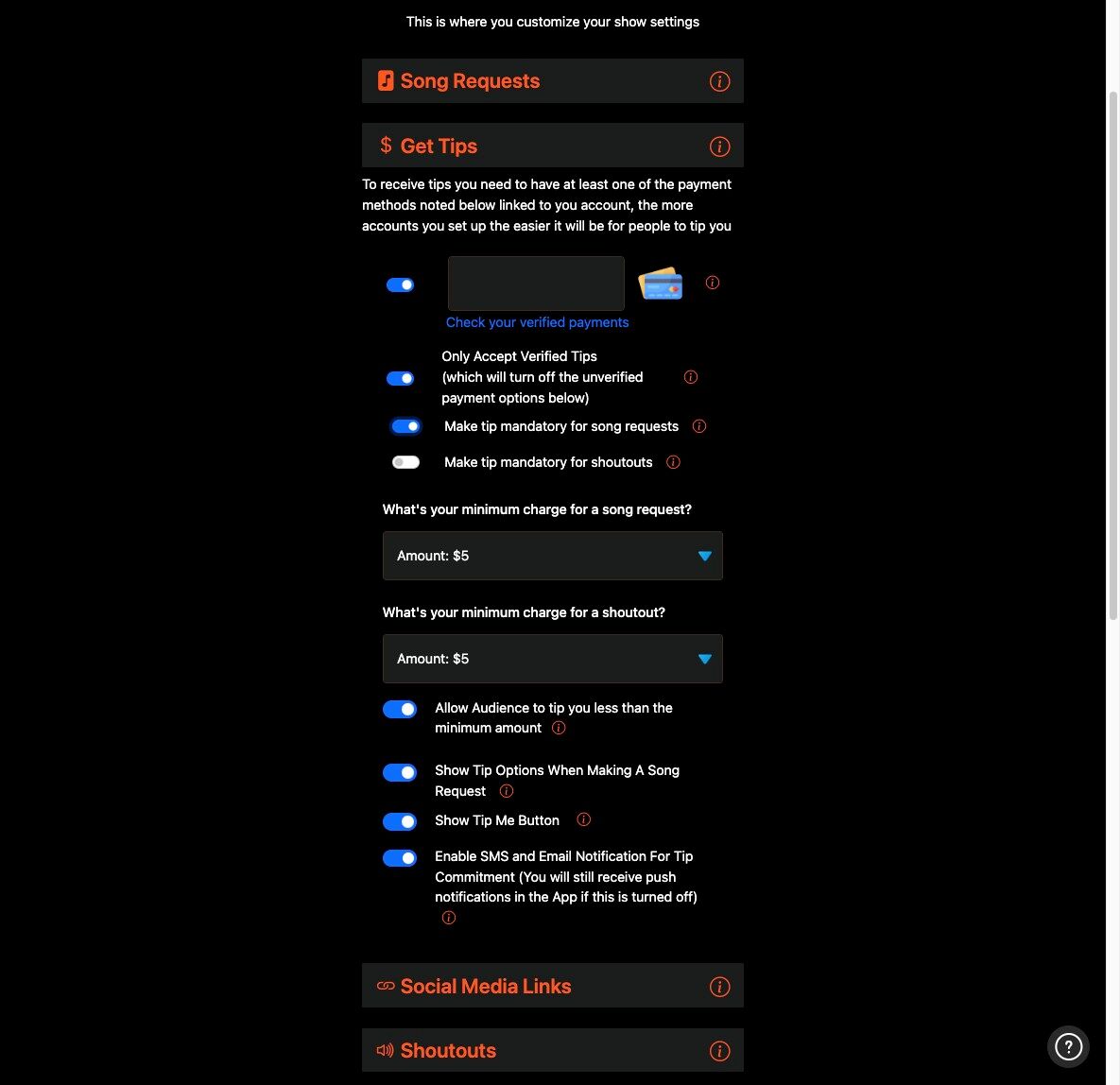 4. You can set minimum amounts for Song Requests. We only receive payment verification for Verified tips so keep this in mind when turning on this option.