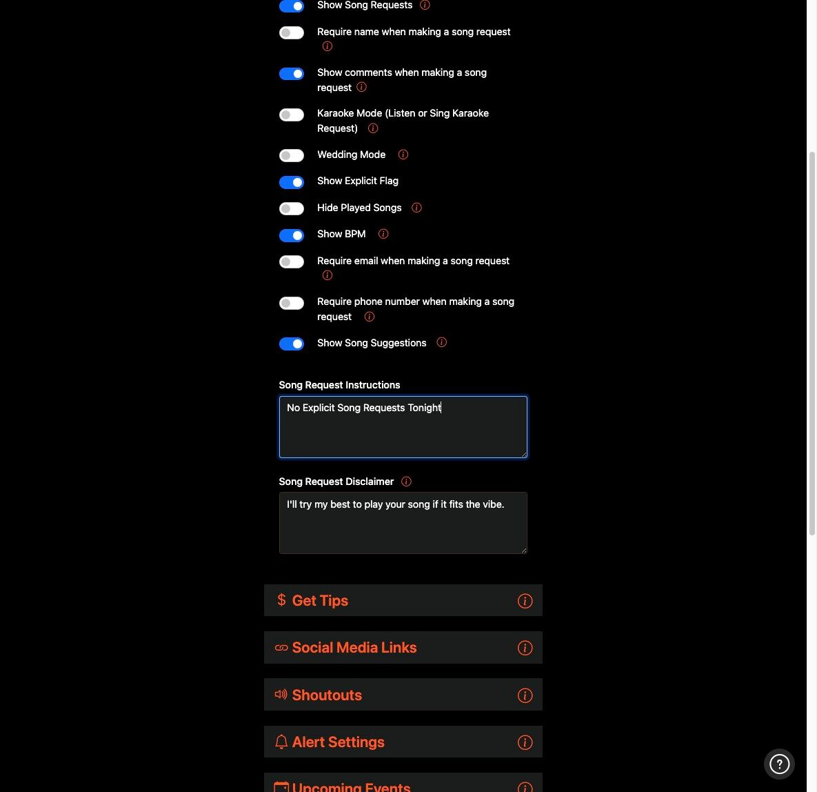 3. Click Accept Song Requests to show the Song Requests Form to your Audience