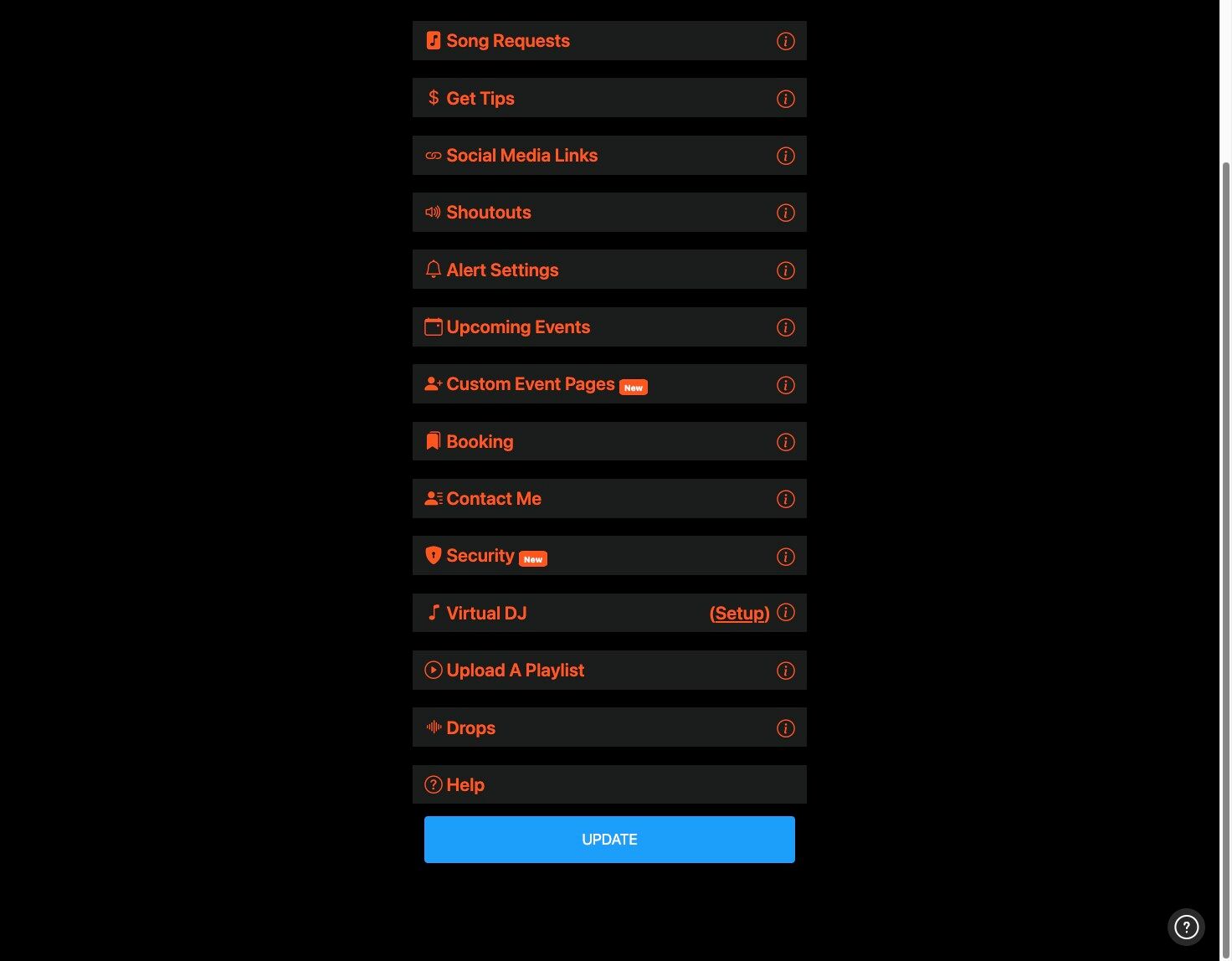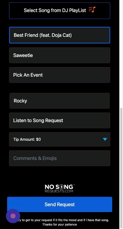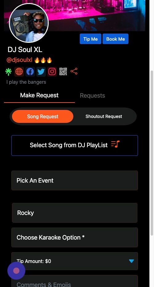 Getting StartedHow to Login and View your Settings How to Update Your Profile Picture How to Update Your Profile Background How to Add Your Short Bio How to Add Your Location How to Add Your Date Format Preference How to Update Your Song Request Disclaimer How to Add Your Emojis How to Add Your Social Media Links How to Add Your Upcoming Events How To Create Custom Event Pages Using the NoSongRequests.com App Getting PaidHow to Add a Payment Type How to Setup Verified Tips How to Configure Your Tip Settings How to Configure Your Song Request Settings How to Configure Your Shoutout Settings How to Configure Your Booking Settings How to Configure Your Contact Me Settings Getting ReadyHow to Print Your QR Code How to Share the DJ or Live Performer Page How to Upload a Playlist How to Configure Your Alert Settings How to Configure Your Karaoke Mode Settings How to Configure Your Virtual DJ Settings Setting up Password Protection on your Song Request Page Download The NoSongRequests.com DJ Drops Managing Song RequestsHow to Sort Requested Songs How to Filter Requested Songs How to Mark a Song as a Favorite How to Add a Comment to a Requested Song How to Mark a Song as Played How to Archive a Requested Song How to Listen to Song Requests How to View Details for a Requested Song How to View Lyrics for a Requested Song How to Share a Requested Song How to Export Requested Songs to DJ Software How to Copy Song Requests to DJ Software Managing Shoutout RequestsHow to View Shoutout Requests How to Send a Message to Requestor Prior to Shoutout How to Mark a Shoutout as Completed How to Archive a Shoutout Request FAQs for the Audience and FansHow to Make a Song Request How to View and Like Song Requests How to View Details for Requested Songs (Cover image, genre, energy level, etc.) How to View Lyrics for Requested Songs How to Listen to Requested Songs How to Add Requested Songs to Your Playlist How to Share Requested Songs with Your Friends How to Make a Shoutout Request How to Tip the DJ or Live Performer How to Inquire about Booking the DJ or Live Performer How to Contact the DJ or Live Performer How to View Upcoming Events for the DJ or Live Performer How to Follow the DJ or Live Performer on Social Media Download our Apps Today! ![]()